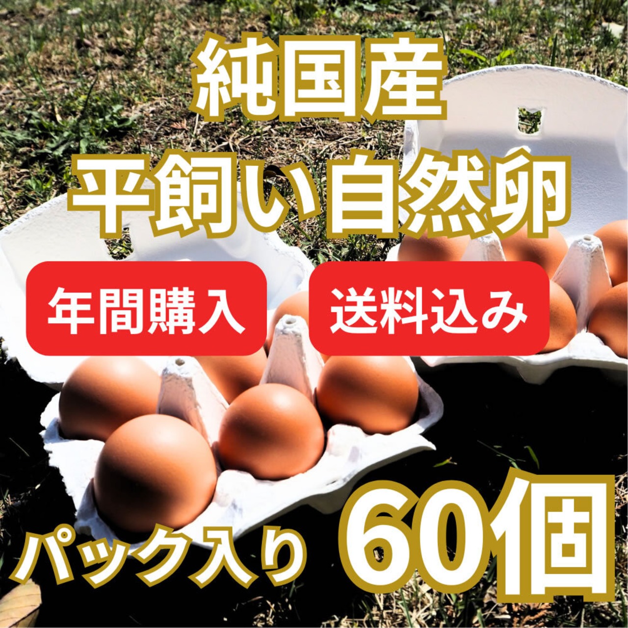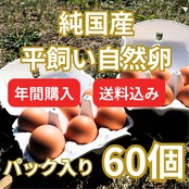 【年間購入】パック入り:純国産平飼い自然卵(有精卵) 60個/月1回(送料別)